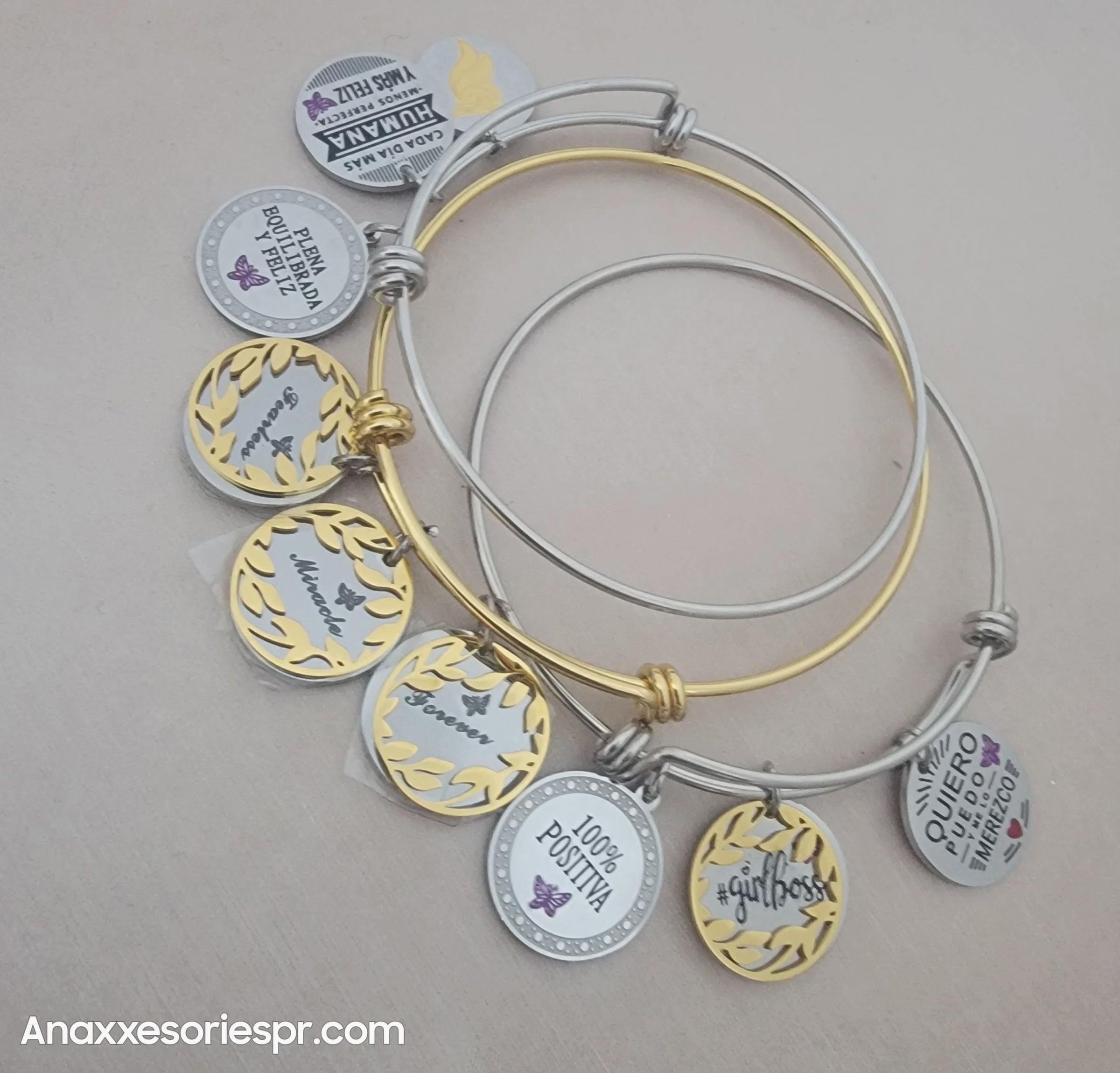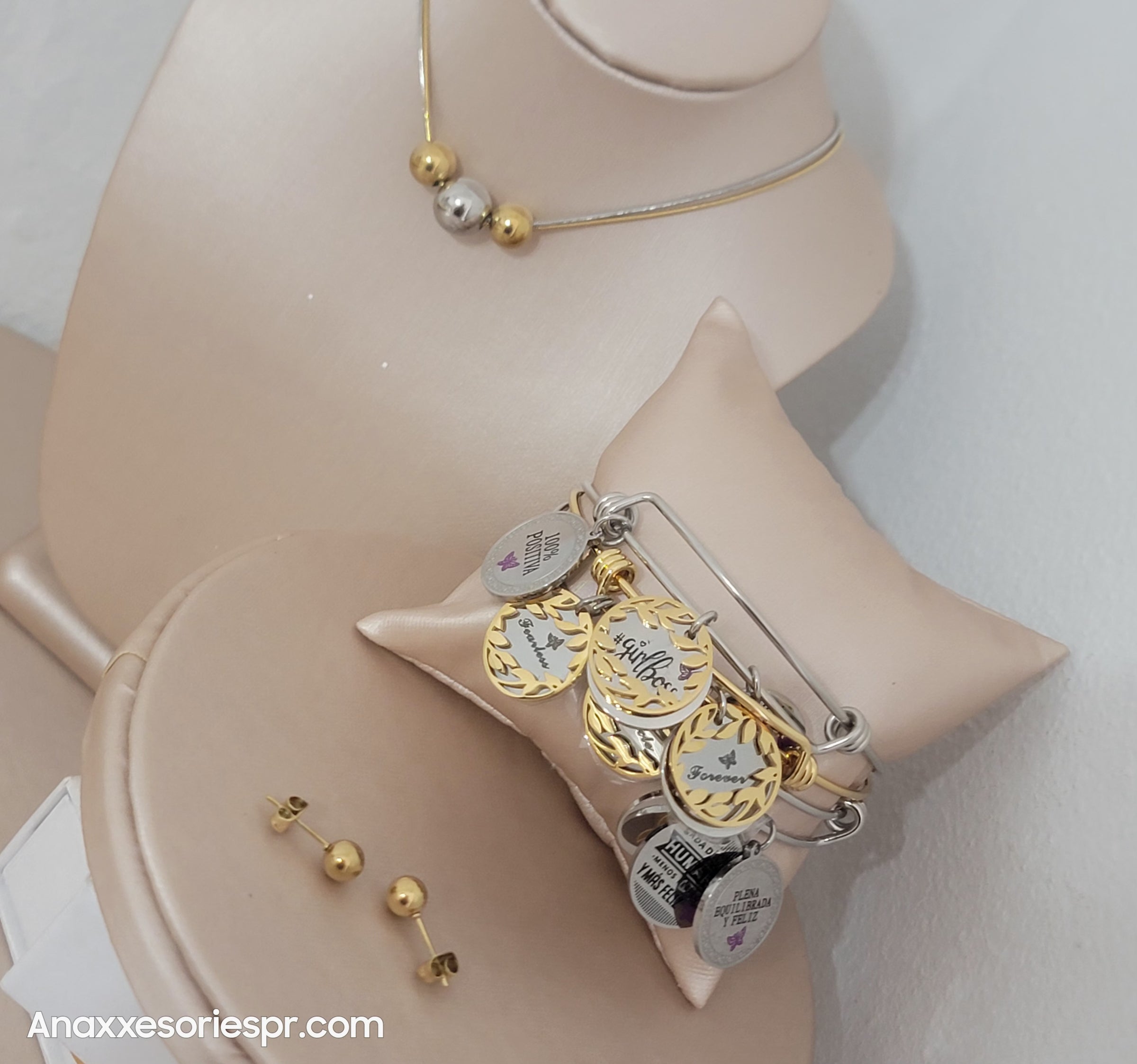 Set doble tono, con pulseras spoken id, collar, aretes y pulseras