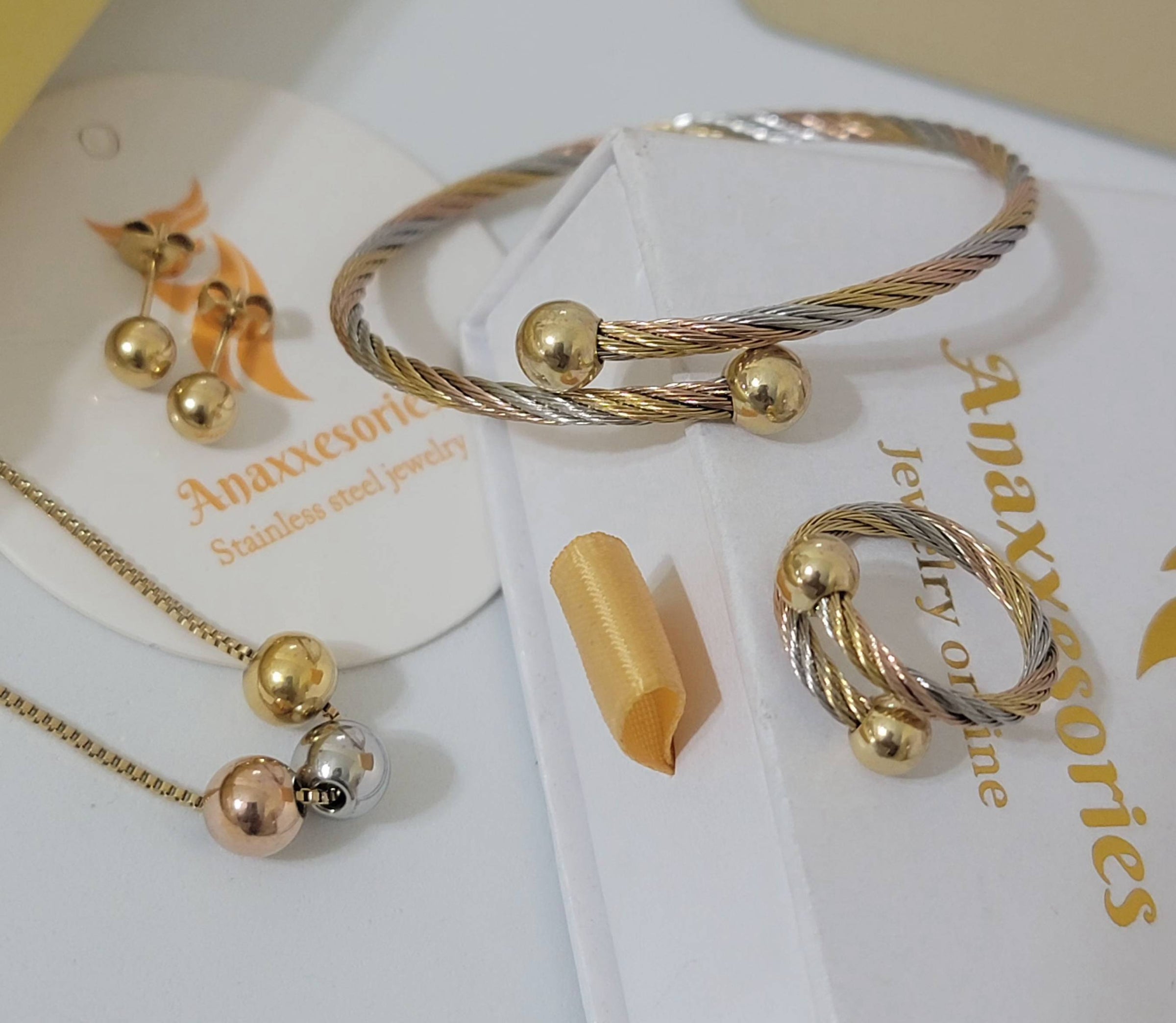 Take your style to the next level with our Trinity bead set! Made with durable stainless steel and featuring a unique triple tono design, this set includes a necklace, earring, ring, and bracelet in a trendy tricolor bead pattern. Perfect for the risk-takers and adventurers looking to elevate their fashion game!